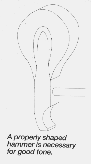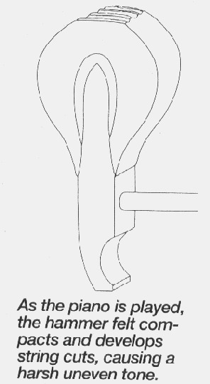 "Every piano has its own unique sound. One might be described as 'glassy,' another as 'warm'. One might have a 'full singing' tone, and yet another sounds 'thin.' Although the original design establishes the basic character of your piano's tone, your technician can modify it to better suit your taste or restore its original tone if it has deteriorated with age. Theprocess of modifying a piano's tone is called voicing." |